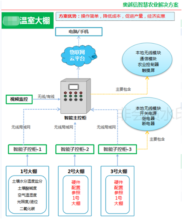 奧越信智慧農(nóng)業(yè)解決方案有現(xiàn)場(chǎng)智能控制及智慧云端遠(yuǎn)程控制兩部分組成,現(xiàn)場(chǎng)智能控制可以在互聯(lián)網(wǎng)出現(xiàn)故障的情況下,其可以獨(dú)立自動(dòng)實(shí)時(shí)監(jiān)測(cè)現(xiàn)場(chǎng)氣候環(huán)境,土壤狀況,作物長(zhǎng)勢(shì),病蟲(chóng)害等情況,并根據(jù)預(yù)設(shè)規(guī)則,對(duì)現(xiàn)場(chǎng)各種農(nóng)業(yè)設(shè)施設(shè)備進(jìn)行自動(dòng)化控制,實(shí)現(xiàn)農(nóng)業(yè)生產(chǎn)環(huán)節(jié)的海量數(shù)據(jù)采集與精準(zhǔn)控制執(zhí)行,執(zhí)行設(shè)備如:通風(fēng)設(shè)備、遮陽(yáng)、澆水,施肥設(shè)備等;奧越信智慧云端遠(yuǎn)程控制可以讓種植農(nóng)戶(hù)通過(guò)手機(jī)APP遠(yuǎn)程監(jiān)測(cè)大棚的各項(xiàng)環(huán)境指標(biāo),包括視頻圖像,并且可以遠(yuǎn)程控制大棚內(nèi)的各項(xiàng)執(zhí)行設(shè)備;