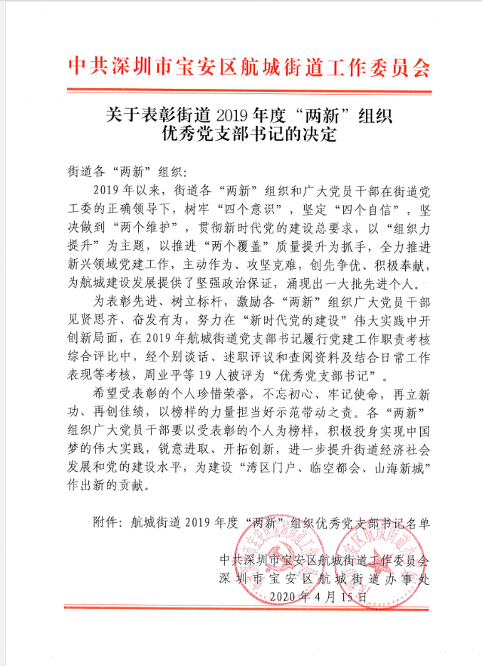 經(jīng)街道黨工委研究決定深圳市奧越信科技有限公司黨支部書記方明同志獲航城街道2019年度“兩新”組織優(yōu)秀黨支部書記。