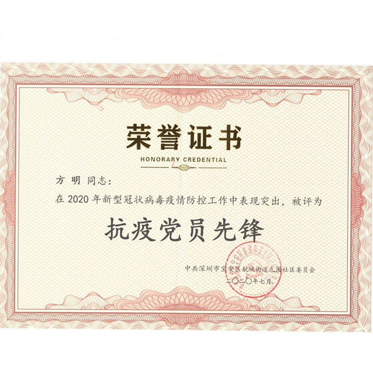 方明同志在2020年新型冠狀病毒疫情防控工作中表現(xiàn)突出,被中共深圳市寶安區(qū)航城街道九圍社區(qū)委員會(huì)評(píng)為抗疫黨員先鋒。