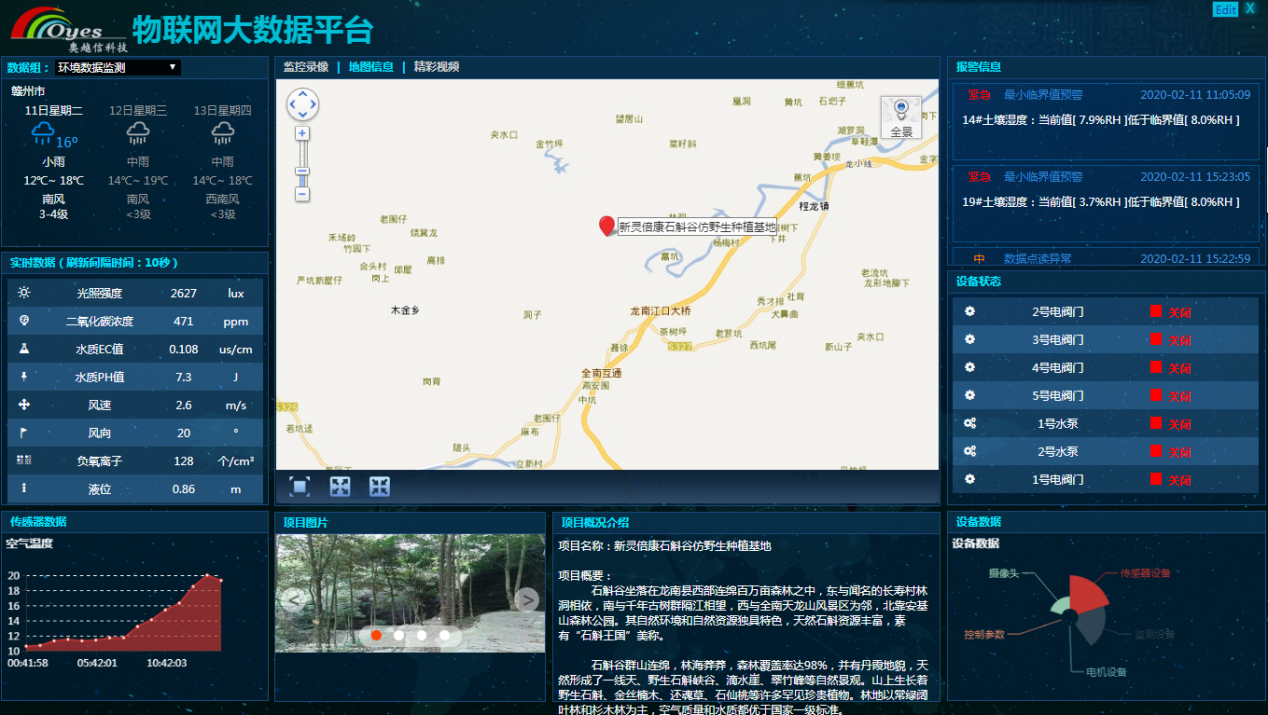 江西康慶堂藥材種植基地位于樟樹(shù)市中洲鄉(xiāng),占地面積約1000畝,種植基地引奧越信農(nóng)業(yè)物聯(lián)網(wǎng)設(shè)備,利用現(xiàn)代物聯(lián)網(wǎng)智能控制設(shè)備,實(shí)時(shí)遠(yuǎn)程獲取種植基地的氣象環(huán)境,土壤墑情,監(jiān)測(cè)蟲(chóng)數(shù)據(jù)等;通過(guò)農(nóng)業(yè)物聯(lián)網(wǎng)云平臺(tái)計(jì)算分析,基地管理人員通過(guò)電腦PC端或手機(jī)端APP或微信小程序?qū)崟r(shí)查看監(jiān)測(cè)現(xiàn)場(chǎng)環(huán)境數(shù)據(jù),土壤墑情,視頻監(jiān)控等;藥材種植基地,還配置了LED戶外顯示屏,可以實(shí)時(shí)顯示氣象站環(huán)境數(shù)據(jù);?蟲(chóng)情測(cè)報(bào)方面配置了一套物聯(lián)網(wǎng)智能蟲(chóng)情測(cè)報(bào)燈,13套風(fēng)吸式太陽(yáng)能殺蟲(chóng)燈等現(xiàn)代農(nóng)業(yè)物聯(lián)網(wǎng)控制設(shè)備;